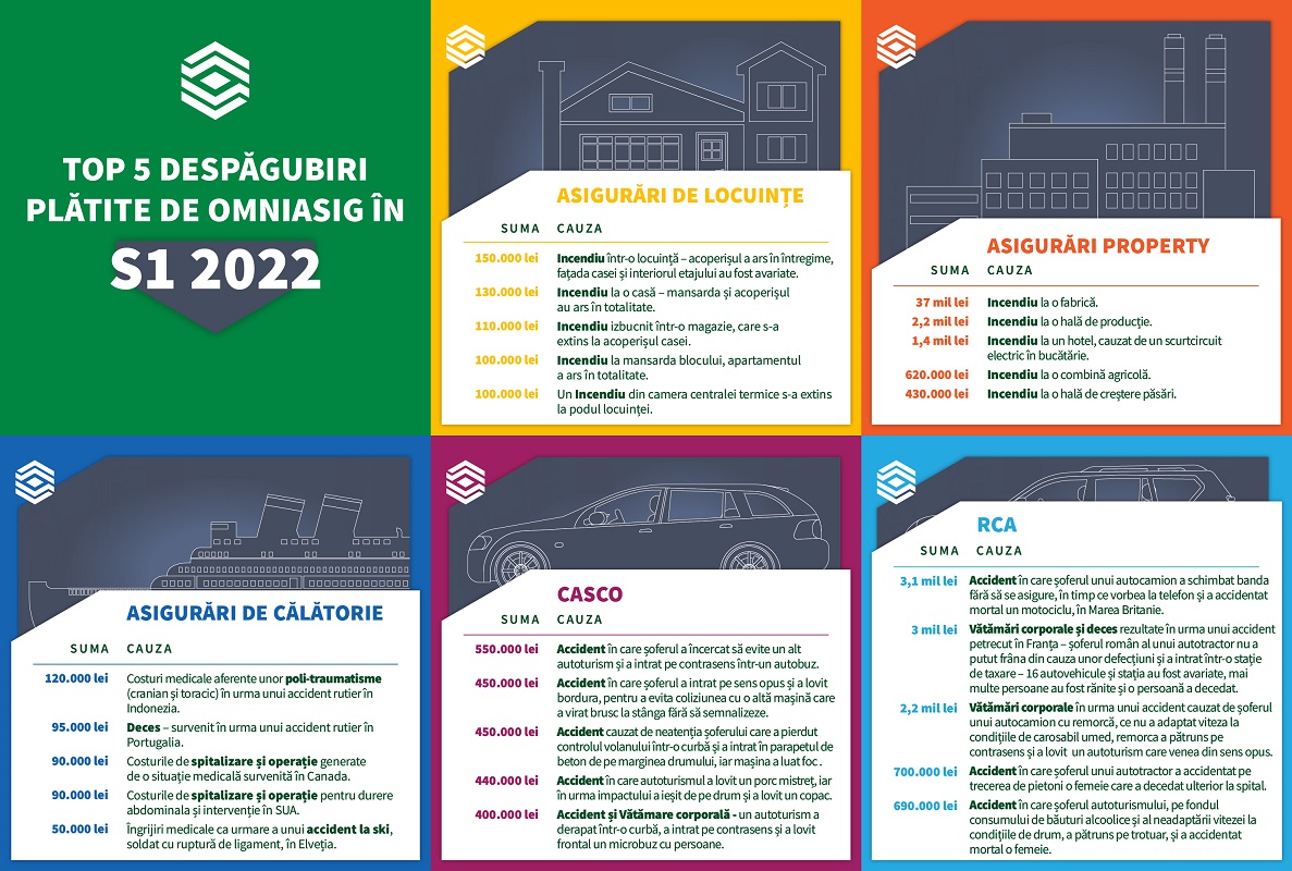 OMNIASIG Vienna Insurance Group susține o comunicare publică transparentă și oferă periodic informații despre activitatea companiei, precum topul celor mai mari despăgubiri plătite pe principalele linii de produse din portofoliul nostru.