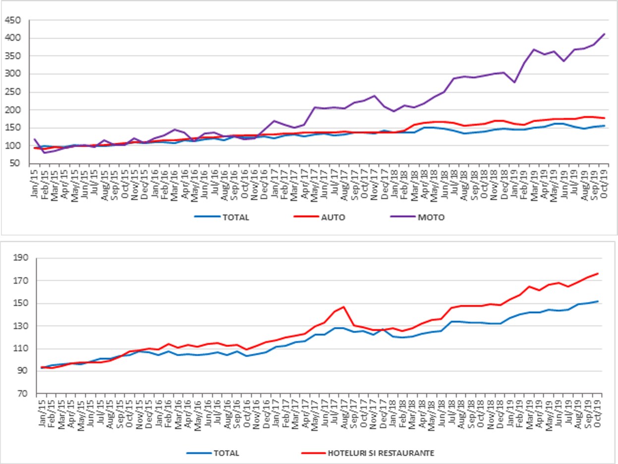 În perioada 1.I-31.X.2019, comparativ cu perioada 1.I-31.X.2018, volumul total al cifrei de afaceri din comerţul cu ridicata şi cu amănuntul, întreţinerea şi repararea autovehiculelor şi a motocicletelor, serie brută, a crescut cu 8,4%, creștere susținută de: comerţul cu motociclete, piese şi accesorii aferente; întreţinerea şi repararea motocicletelor (+35,8%), comerţul cu piese şi accesorii pentru autovehicule (+9,0%), comerţul cu autovehicule (+7,9%) şi activităţile de întreţinere şi reparare a autovehiculelor (+7,3%) .