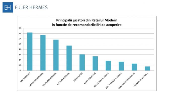 București, 1 august 2018. Euler Hermes, liderul global în asigurarea de credit comercial şi recunoscut specialist în domeniul garanţiilor şi al colectării creanţelor, estimează valoarea pieței de retail modern la 17-20 de miliarde de euro, principalele nume din top după cifra de afaceri fiind Kaufland, Carrefour, Lidl și Auchan.