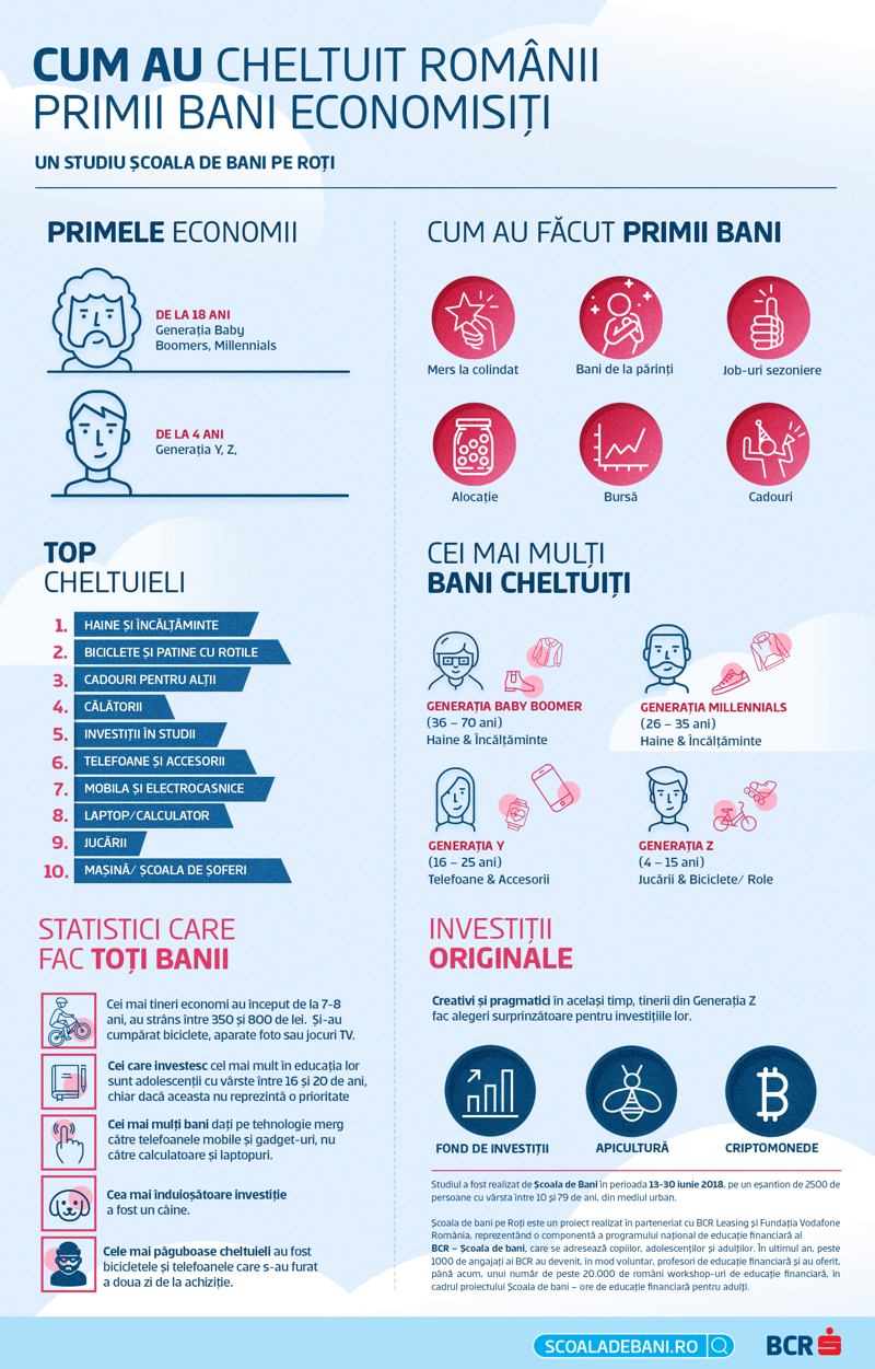 Potrivit studiului, copiii din ziua de azi încep să economisească mai devreme, inclusiv la vârsta de patru ani, pe când părinții și bunicii făceau acest lucru după 18 ani. Cei mai mulți copii strâng în medie între 350 și 800 de lei pe an, cu care își cumpără biciclete, aparate foto sau jocuri TV, iar cei care investesc cei mai mult în educație sunt adolescenții cu vârste între 16 și 20 de ani.