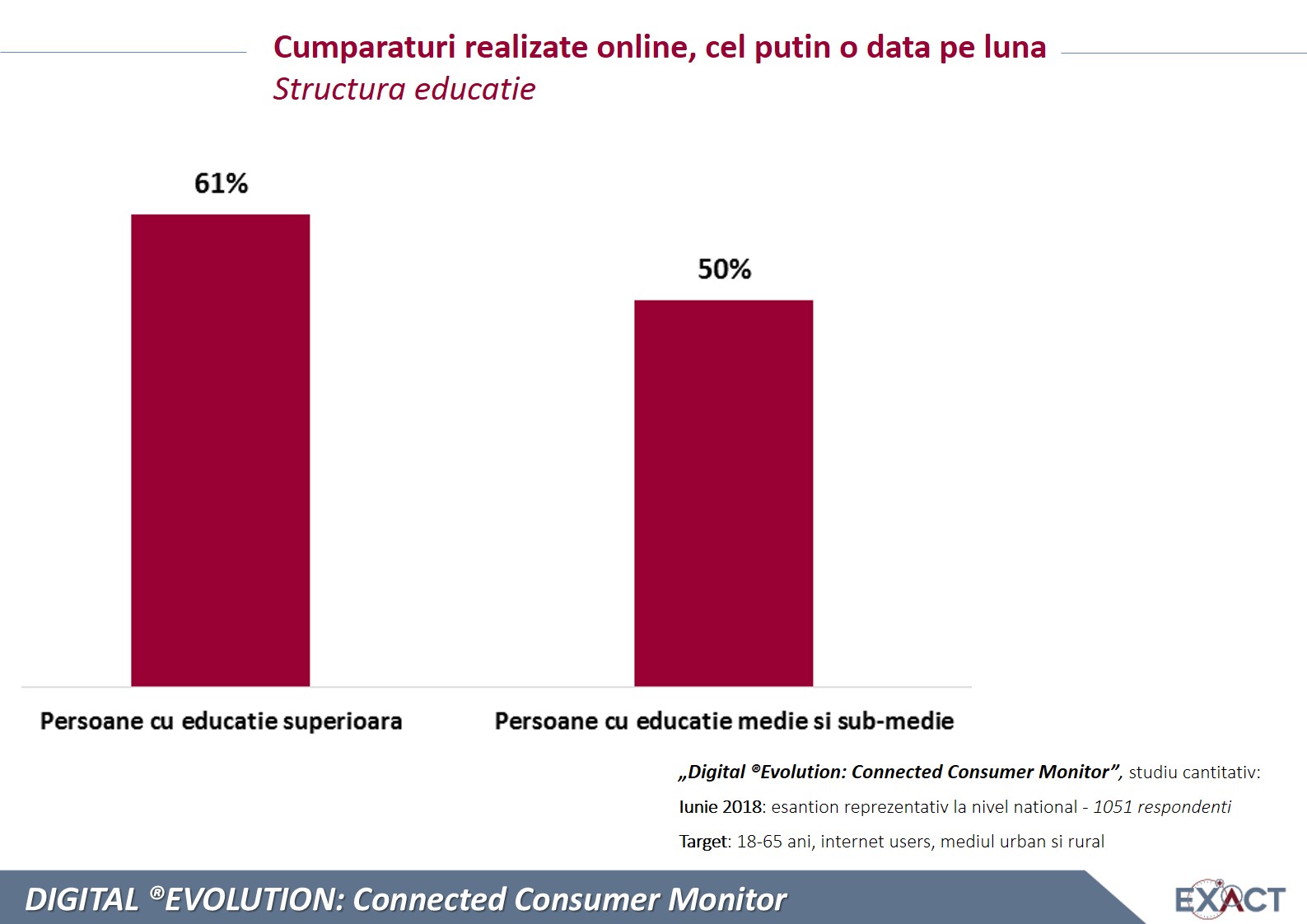 Bărbații sunt ceva mai activi decât femeile atunci când ne referim la cumpărăturile realizate online cel puțin o dată pe lună: 59% / vs / 52%. Analizând comportamentul online de cumpărare în funcție de educație, constatăm că persoanele cu educație superioară fac cumpărături online cel puțin o dată pe lună în procent de 61%, în timp ce cele cu un un nivel mediu și sub-mediu de educație, în procent de 50%.