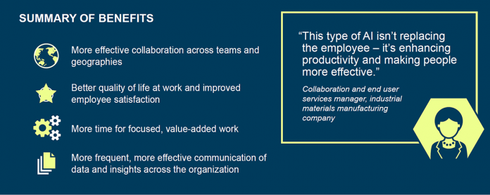 „[Această tehnologie] înseamnă și că vom putea să revenim mai repede la clienții noștri, să încheiem tranzacții de vânzări mai rapid și, în cele din urmă, acest lucru va însemna venituri mai mari”, spune în cadrul studiului un director senior de operațiuni și securitate IT, de la o companie globală de servicii IT. Într-un studiu asociat care a cuprins interviuri cu lideri IT de la șapte organizații globale care beneficiază de capabilitățile AI în Microsoft 365, Forrester Consulting a proiectat impactul financiar direct al acestor tehnologii pentru o organizație globală cu 8500 de angajați „white collar”. Cuantificate, câștigurile prin creșterea în productivitate și de eficiență au fost astfel estimate la 36,6 milioane de dolari, pe parcursul a patru ani.