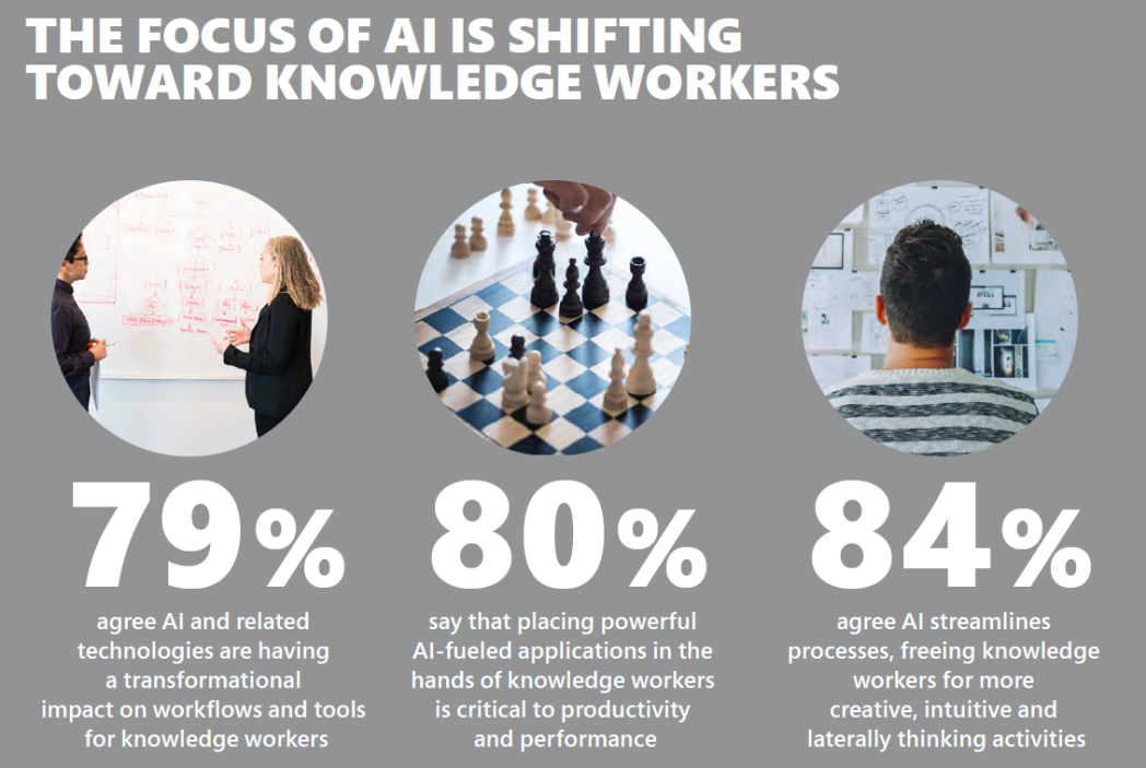 Potrivit studiului Forbes Insights: AI zi de zi: Exploatarea Inteligenței Artificiale pentru capacitarea lucrătorului de profil „79% sunt de acord că AI are deja un impact transformator asupra fluxurilor și instrumentelor de lucru pentru lucrătorii de profil, dar numai 5% dintre directori consideră companiile lor ca fiind lideri în industrie în materie de exploatare a proceselor bazate pe AI”.