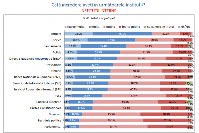 Armata continuă să fie instituția internă în care românii au cel mai ridicat nivel de încredere, 68,1% declarând că au încredere mare și foarte mare în această instituție, în creștere față de sondajele precedente (64,1% declarau același lucru în ianuarie 2019, respectiv 66,7% în luna noiembrie 2018). Urmează Biserica cu 55,1% (54,5% în ianuarie 2019, 52,8% în noiembrie 2018), Jandarmeria cu 48,1% (43,5% în ianuarie 2019 și 49,3% în noiembrie 2018) și Poliția cu 43,2% (41,2% în ianuarie 2019, respectiv 43,5% în noiembrie 2018).