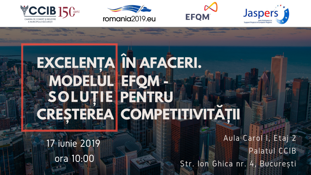 Camera de Comerț și Industrie a Municipiului București (CCIB) organizează, sub auspiciile Președinției României la Consiliul Uniunii Europene, în colaborare cu EFQM (the European Foundation for Quality Management) și JASPERS conferința „Excelența în afaceri. Modelul EFQM – soluție pentru creșterea competitivității”. Evenimentul va avea loc miercuri, 19 iunie 2019, începând cu ora 10.00 (înregistrarea de la ora 9.30), în Aula Carol I (Palatul CCIB, Strada Ion Ghica nr. 4, sector 3).