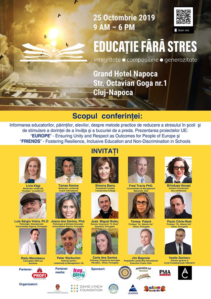 În cadrul evenimentului, vor fi analizate rezultatele a două proiecte cofinanțate de Uniunea Europeană intitulate EUROPE și FRIENDS, desfășurate din 2016, la care au participat aproximativ 2000 de elevi, cadre didactice și părinți din Anglia, Belgia, Italia, Olanda, Portugalia și Suedia. Acestea au introdus în școli o perioadă de liniște de 10 – 15 minute, înaintea orelor de clasă și după ore, în care, cine dorește, poate practică o tehnică naturală psihofiziologică de relaxare profundă, numită meditație transcendentală și cine nu, doar stă liniștit. Rezultatele par surprinzătoare. Aceste pauze speciale au readus armonia în școală. Profesorii și elevii au relații mai bune, dorința de învățare a sporit, elevii sunt mai creativi, violența în școală a fost redusă semnificativ, iar fenomenul de burn out în rândul profesorilor a înregistrat scăderi importante.