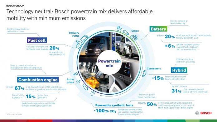 Bosch face pași importanți și înspre comercializarea sistemului de propulsie pe bază de celule de combustie, dezvoltând împreună cu Powercell componenta de bază a acestuia, ansamblul de baterii, pe care plănuiește să o lanseze în 2022. De asemenea, compania continuă să investească în motoarele cu combustie internă deosebit de eficiente. Conform unui studiu de piață Bosch, două din trei autovehicule noi înmatriculate în 2030 vor fi echipate în continuare cu un motor diesel sau cu aprindere prin scânteie, cu sau fără o opțiune hibrid. Acesta a continuat: „Calea către o mobilitate fără emisii trebuie să fie neutră din punct de vedere tehnologic. Este singurul mod în care putem face mobilitatea accesibilă pentru publicul larg”. Soluția este o combinație între motoarele cu combustie internă deosebit de eficiente și motoarele electrice de ultimă generație. În plus, Denner încurajează utilizarea carburanților sintetici obținuți din surse regenerabile: „Și autovehiculele mai vechi aflate încă în circulație trebuie să contribuie la reducerea emisiilor de CO2. Carburanții sintetici obținuți din surse regenerabile de energie pot contribui la un proces de combustie neutru din punctul de vedere al emisiilor de carbon”. În acest scop, Denner solicită factorilor de decizie politică implementarea cadrului pentru un mediu neutru din punct de vedere tehnologic și, prin urmare, un mediu care încurajează inovația. Este un pas necesar spre o tranziție reușită către mobilitatea alternativă, menținând locurile de muncă existente și creând altele noi, a spus Denner.