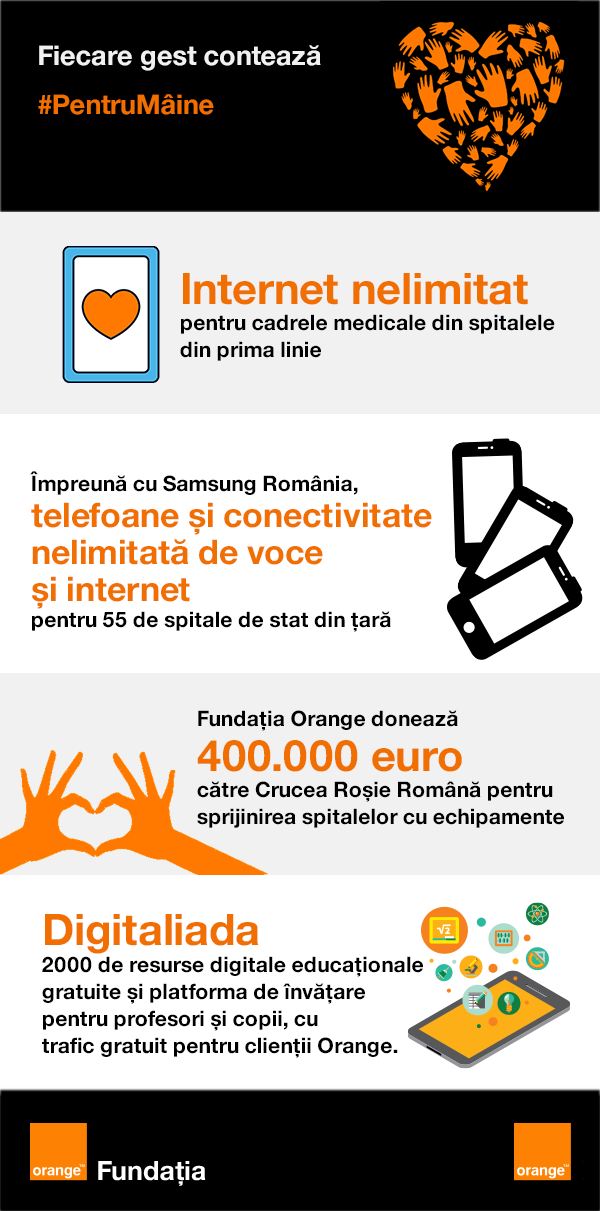 Orange România, alături de Fundaţia Orange, continuă să sprijine comunităţile şi societatea românească. Astfel, Fundația Orange se implică în lupta împotriva noului coronavirus prin alocarea sumei de 400.000 EUR către Crucea Roșie Română. Suma va fi folosită pentru dotarea secțiilor de ATI cu aparate de ventilație artificială pentru spitale publice din țară, precum şi pentru achiziționarea de echipamente de protecţie.