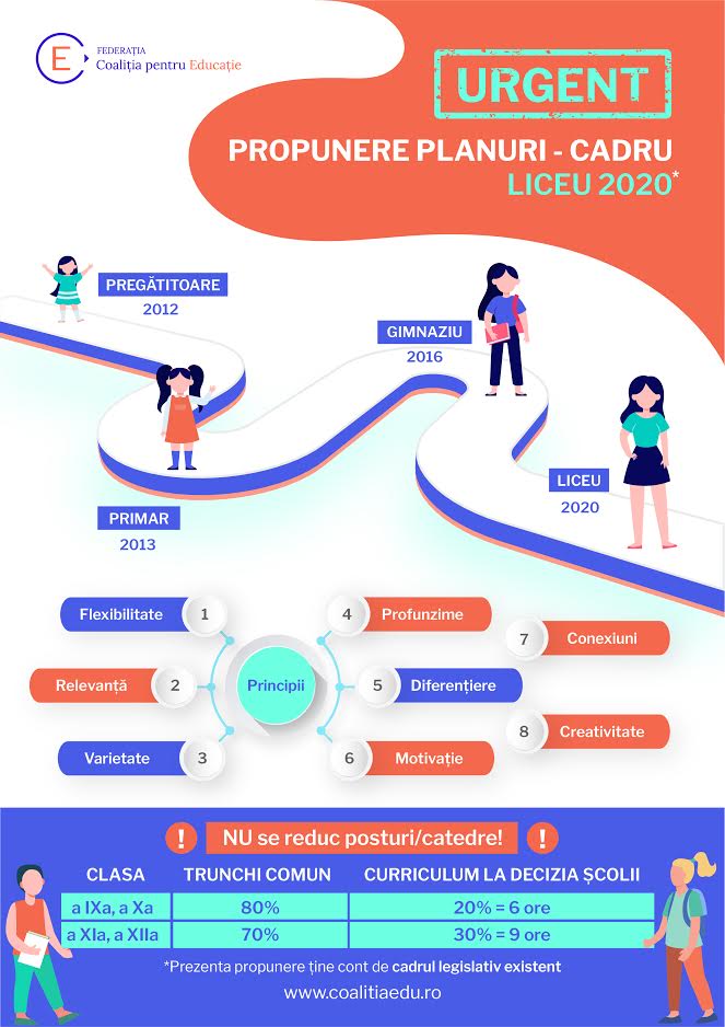 24 august 2020 – Federația Coaliția pentru Educație consideră că este important ca planurile-cadru pentru liceu să fie aprobate cât mai urgent și propune o nouă perspectivă asupra acestora, propunere susținută și de către Consiliul Național al Elevilor. Legea educației naționale nr. 1/2011 a introdus clasa pregătitoare, obligatorie pentru toți elevii din România. O dată cu aceasta, în 2012 a început un amplu proces de reformă curriculară care ajunge, în anul 2021, la elevii de liceu. Din experiența procesului de consultare și aprobare a planurilor cadru pentru gimnaziu, este nevoie de cel puțin un an școlar (2020/2021) pentru adaptarea acestui cadru, după aprobare, la diferitele profiluri și specializări, pentru realizarea programelor școlare și a manualelor necesare.