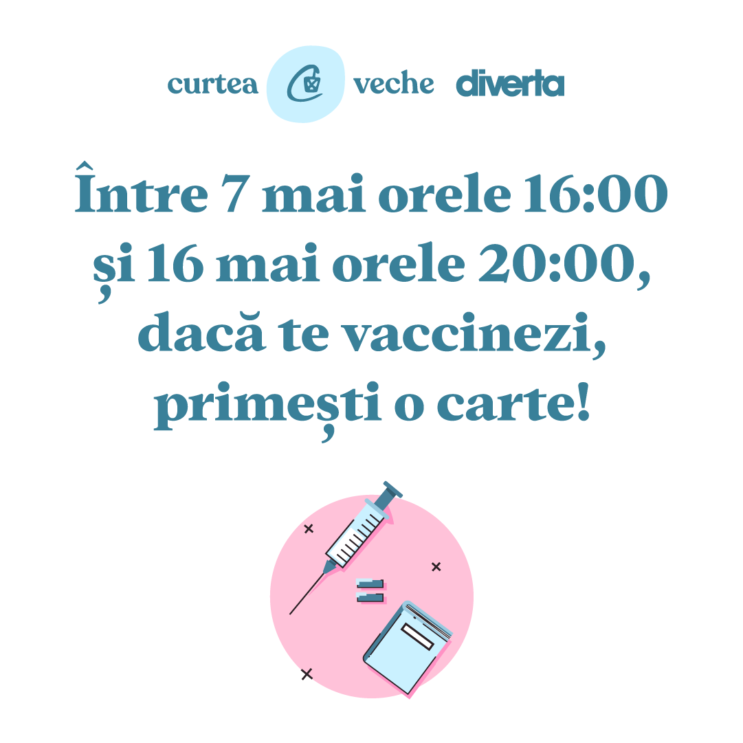 Pentru fiecare persoană care se vacinează în perioada 7-16 mai, Curtea Veche Publishing oferă câte o carte. Pentru că vaccinarea merge mână-în-mână cu informarea, Curtea Veche Publishing recompensează curajul celor care trec pragul centrelor de vaccinare în această săptămână. Cei care primesc prima doză de vaccin anti-COVID-19 în perioada 7 mai (începând cu ora 16:00) – 16 mai (până la ora 20:00) și prezintă dovada vaccinării în orice magazin Diverta din București vor primi o carte de ficțiune, non-ficțiune sau pentru copii, la alegere în limita stocului disponibil.