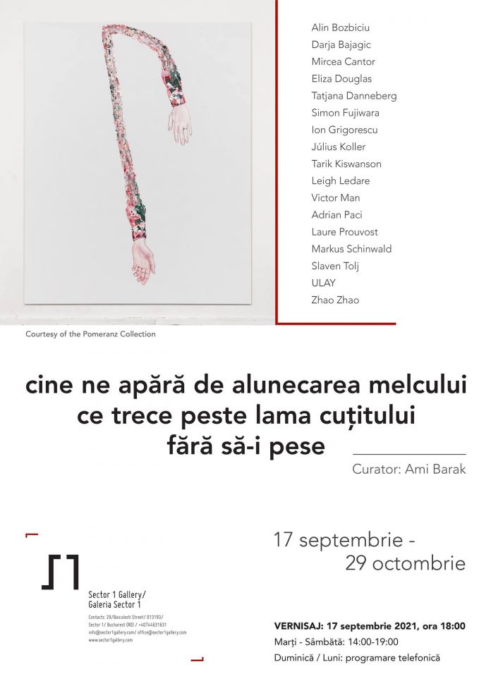 Galeria Sector 1 prezintă expoziția de grup cine ne apără de alunecarea melcului / ce trece peste lama cuțitului / fără să-i pese, care va putea fi vizitată în perioada 17 septembrie – 29 octombrie 2021, la Galeria Sector 1 din București. Curatoriată de Ami Barak, curator independent și critic de artă care trăiește la Paris, fost președinte al Asociației internaționale a curatorilor de artă contemporană, expoziția aduce laolaltă 17 artiști internaționali care lucrează într-o varietate de medii și care au abordări artistice diferite, ale căror lucrări fac parte din colecția de artă Pomeranz din Viena, Austria. Printre artiștii selectați se numără artiștii români Mircea Cantor, Victor Man, Alin Bozbiciu și Ion Grigorescu, alături de Darja Bajagic, Eliza Douglas, Tatjana Danneberg, Simon Fujiwara, Július Koller, Tarik Kiswanson, Leigh Ledare, Adrian Paci, Laure Prouvost, Markus Schinwald, Slaven Tolj, ULAY și Zhao Zhao.