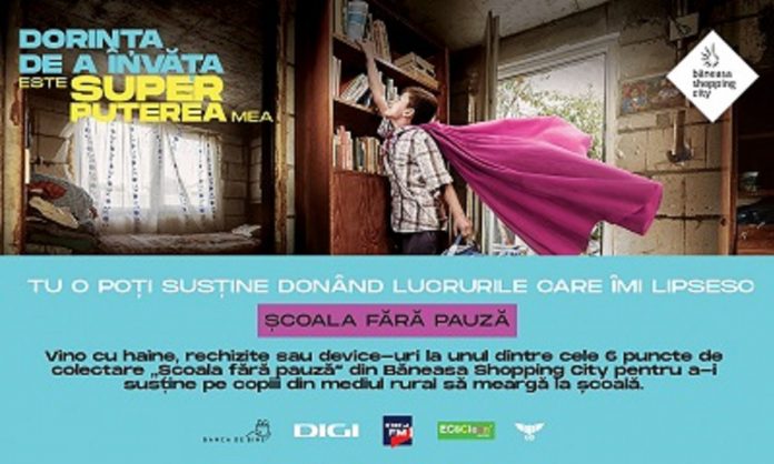 Astfel, până la data de 24 decembrie, în fiecare zi, de luni până duminică, cei care doresc să se implice, să arate solidaritate și să transforme acțiunea de a dona într-o mișcare socială pentru un viitor neîntrerupt în rândul copiilor cu vârste cuprinse între 5 și 18 ani, proveniți din medii defavorizate, pot aduce la unul dintre cele șase spații dedicate de colectare „Școala Fără Pauză”, amplasate în centrul comercial Băneasa Shopping City, îmbrăcăminte, încălțăminte, rechizite și echipamente tehnologice, toate în stare bună, curate, complete și funcționale. Donațiile vor fi distribuite școlilor aflate în comunități rurale vulnerabile din 10 județe: Teleorman, Giurgiu, Prahova, Ialomița, Suceava, Olt, Vaslui, Dâmbovița, Mureș și Hațeg.