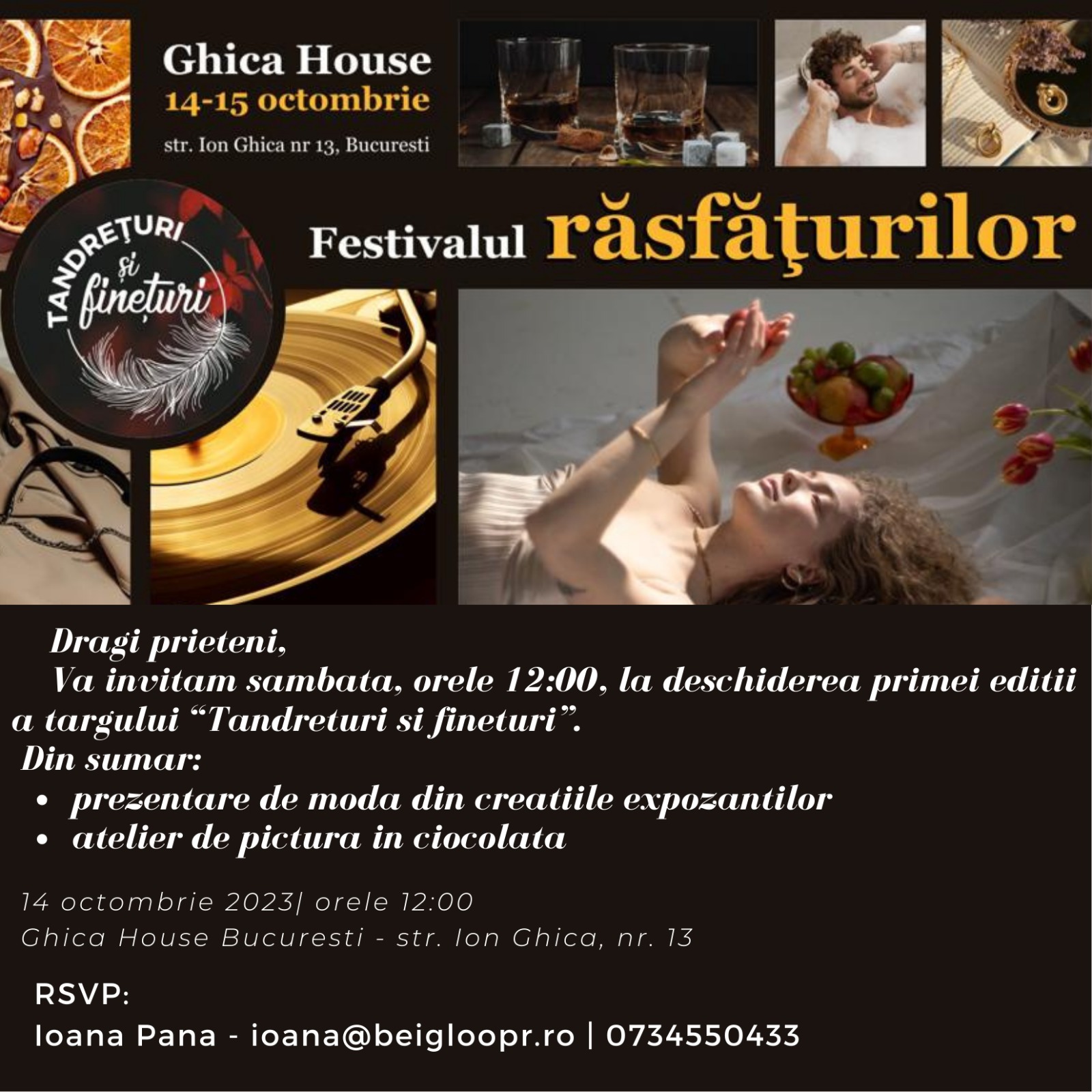 “Tandrețuri și finețuri” se va desfășura între 14 și 15 octombrie, la Casă Ghica din centrul vechi al Bucureștiului, între orele 10:00 și 20:00 (sâmbătă) și 10:00-18:00 (duminică).