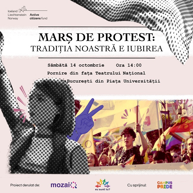 Asociația MozaiQ, organizație comunitară LGBT+ (lesbiene, gay, bisexuali și persoane transgender), organizează sâmbătă, 14 octombrie Marșul de Protest ”Tradiția Noastră E Iubirea”.