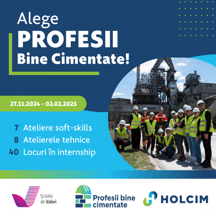 150 de studenți de la facultățile tehnice, vor avea oportunitatea de a descoperi cum să-și dezvolte o carieră în domeniul construcțiilor în cadrul celei de-a V-a ediții a programului „Profesii Bine Cimentate”. Programul este desfășurat de Școala de Valori, alături de Grupul Holcim România cu scopul de a facilita integrarea pe piața muncii a studenților cu profil tehnic, de a face cunoscută tinerilor cariera în domeniul construcțiilor, dar și pentru a le prezenta oportunitățile de dezvoltare profesională și personală. Studenții se pot înscrie în program până pe 2 februarie 2025, pe pagina de site a proiectului: https://scoaladevalori.ro/profesii-bine-cimentate/ .