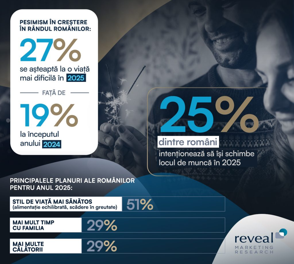 Conform celui mai recent studiu al Reveal Marketing Research, pesimismul este în creștere în rândul românilor în privința anului 2025, 27% se așteaptă la o viață mai dificilă în noul an, comparativ cu 19% anul trecut.
