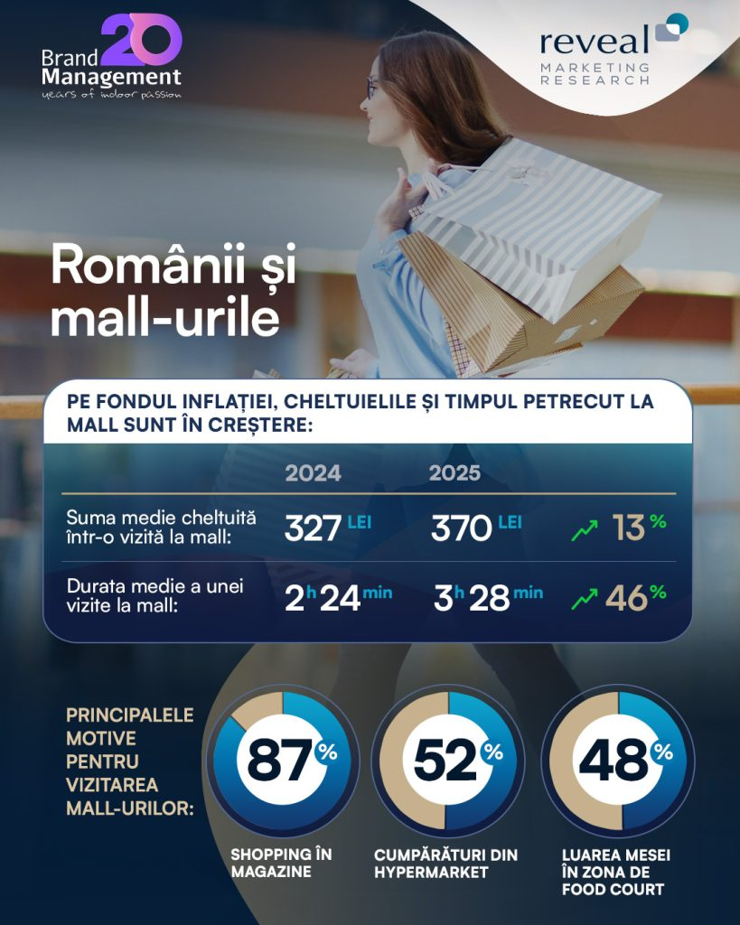 „În ianuarie 2025, rata anuală a inflației atingea pragul de 5%, factor ce explică atât creșterea bugetului alocat de români pentru o vizită la mall, cât și prudența în gestionarea cheltuielilor, reflectată printr-o durată mai mare de timp petrecută în aceste locații. Cu toate acestea, chiar și în contextul preocupărilor financiare, fascinația pentru mall-uri rămâne puternic înrădăcinată în comportamentul românilor, fie pentru cumpărături, servicii rapide, experiențe de food&beverage sau momente de relaxare.” a declarat Marius Luican, Director General Reveal Marketing Research.