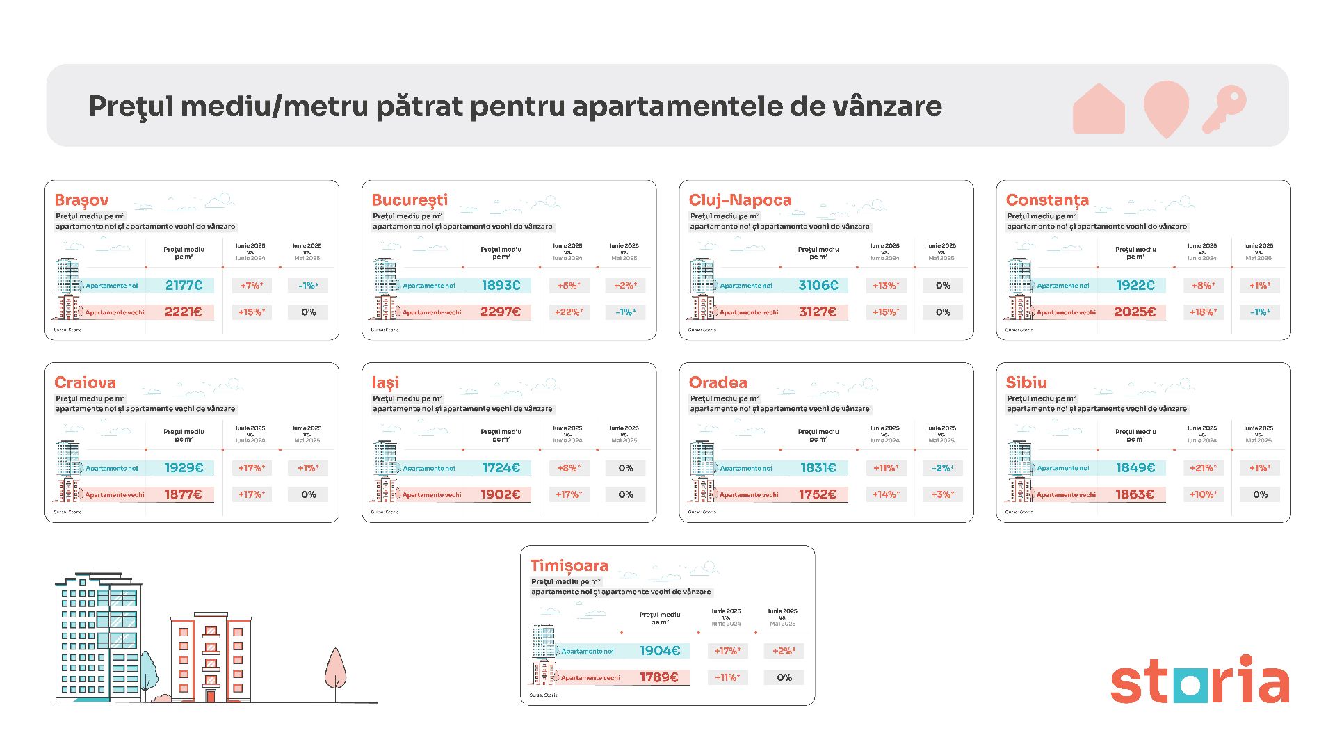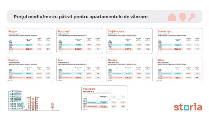 În luna iunie, prețurile apartamentelor noi și vechi din marile orașe ale României au înregistrat o creștere de 12% față de aceeași perioadă a anului trecut, conform analizei Storia, platforma de imobiliare lansată de OLX. Cele mai accentuate creșteri anuale, cumulate pentru ambele categorii de locuințe, au fost observate în Craiova (+17%), Sibiu (+15%) și Cluj-Napoca (+14%). La polul opus, cele mai temperate evoluții anuale (+12%) ale prețurilor au fost înregistrate în Brașov, București și Oradea.