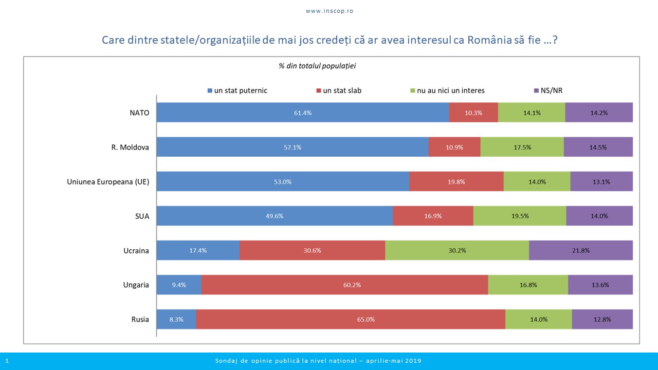 Majoritatea românilor (61,4%) este de părere că NATO are interesul ca România să fie un stat puternic. 57,1% sunt de aceeași opinie în ceea ce privește Republica Moldova, 53% în privința Uniunii Europene și 49,6% în privința SUA. Doar 17,4% dintre români consideră că Ucraina are interesul ca România să fie un stat puternic, în timp ce 30,6% sunt de părere că statul vecin are interesul ca România să fie un stat slab. 60,2% cred că Ungaria are interesul ca România să fie un stat slab și 65% sunt de aceeași părere în privința Rusiei.