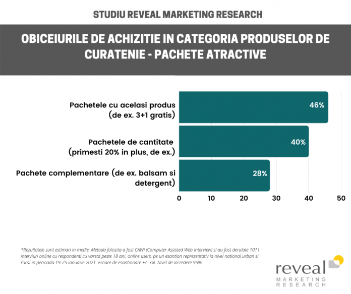 În medie, 46% dintre români spun că preferă ofertele cu același produs, de tipul 3+1 gratis, 1+1 gratis, atunci când  vine vorba despre produsele de curățenie, iar 40% dintre români, în medie, optează pentru ofertele de cantitate, de tipul primești 20% în plus din produsul respectiv, pentru același preț. Pachetele complementare (de exemplu, balsam + detergent) au fost menționate de 28% dintre respondenți ca fiind atractive.