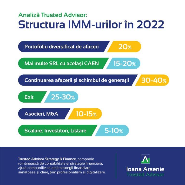 „Fiecare antreprenor și fiecare afacere trebuie să stabilească în ce etapă se află, în care categorie se încadrează, având în vedere potențialul dar și intenția de dezvoltare. În funcție de acest lucru, se parcurg etape specifice pregătitoare și se au în vedere oportunitățile, dar și punctele de atenție. Decizia luată din scurt penalizează rezultatele, fie că vorbim de asocieri, exit sau celelalte opțiuni″, declară Ioana Arsenie, strateg financiar si Fondator Trusted Advisor Strategy & Finance.