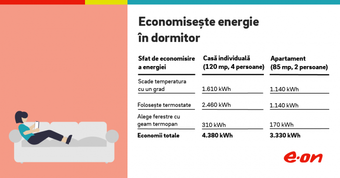 • Prin scăderea temperaturii din dormitor cu 1°C reducem consumul anual de energie cu până la 1.610 kWh;
