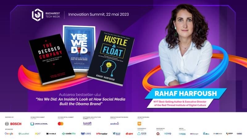 Celebrul antropolog digital Rahaf Harfoush, cel mai bine vândut autor care cercetează impactul tehnologiilor emergente asupra societății, va fi prezentă la cea de-a 7-a ediție a Bucharest Tech Week, în cadrul Innovation Summit, prima conferință de business care deschide săptămâna tehnologiei.