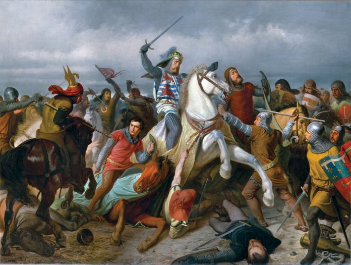 1346: Războiul de O Sută de Ani: În Bătălia de la Crecy, englezii au ieșit învingători datorită dotării lor cu arcuri lungi englezești.