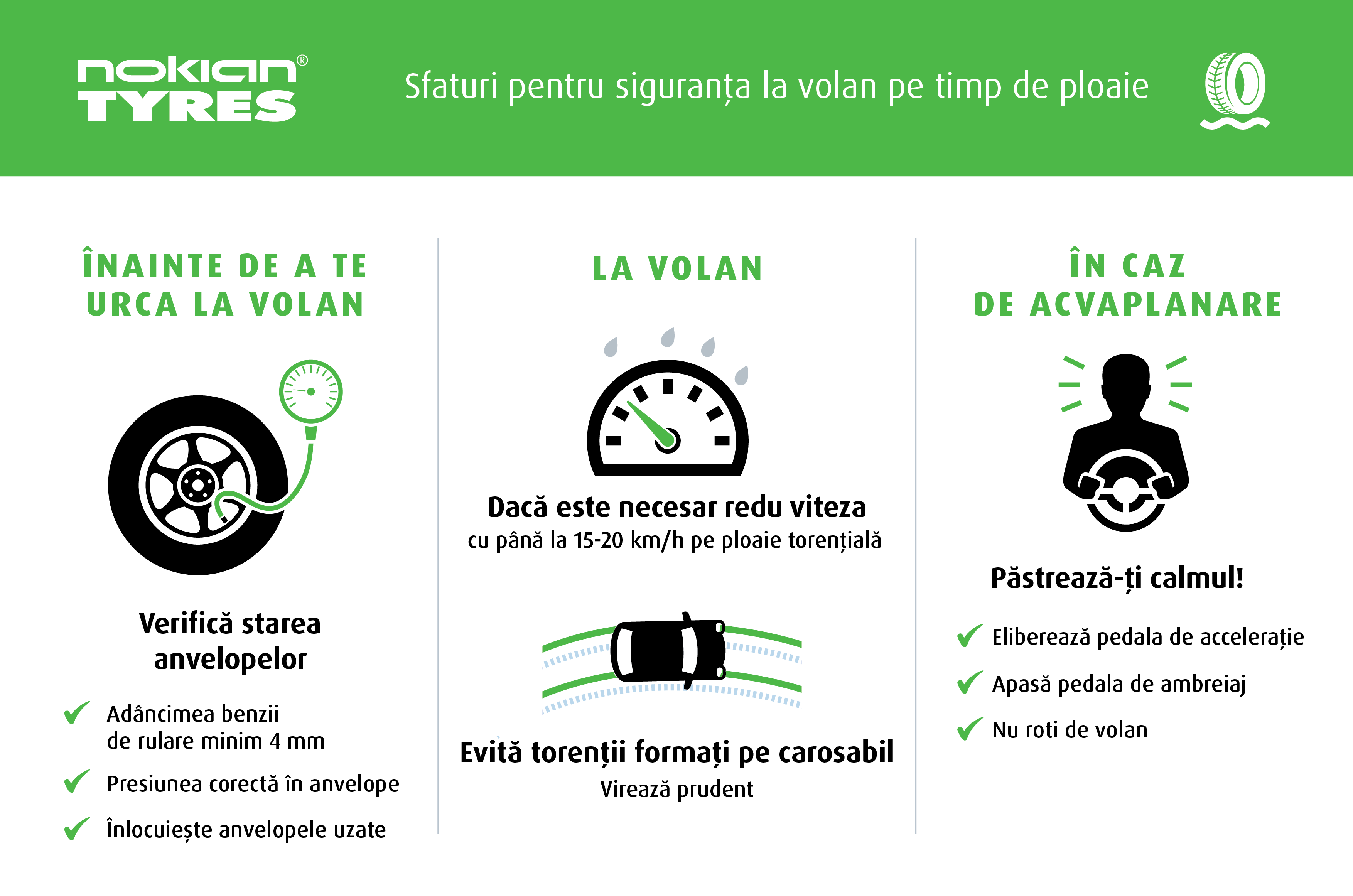 „Aversele și anvelopele uzate nu sunt deloc o combinație fericită. De altfel, dacă viteza ta de rulare este prea mare, mașina va acvaplana chiar dacă anvelopele sunt bune. Pe ploaie torențială este indicat să reduci viteza cu până la 15-20 km/h, pentru a permite benzilor de rulare ale anvelopelor să elimine toată apa acumulată între acestea și asfalt,” explică Matti Morri, Technical Customer Service Manager la Nokian Tyres.