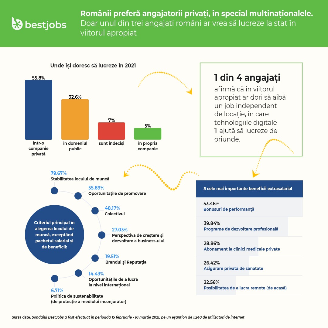 15 martie 2021. Cei mai mulți dintre români (55,8%) își doresc să lucreze într-o companie privată în următoarea perioadă, în special într-una de talie mare, precum o multinațională, în timp ce un procent semnificativ de 32,6% ar vrea să lucreze în domeniul public, relevă datele unui sondaj BestJobs despre tendințele pe piața muncii în 2021. Sub 5% dintre respondenți au declarat că își doresc să lucreze în propria companie, iar 7% sunt indeciși.