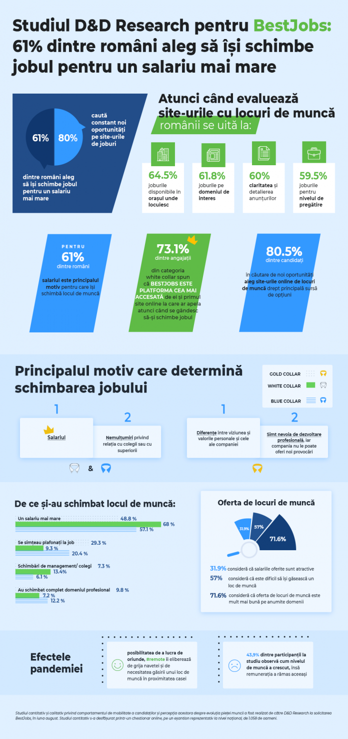 12 octombrie 2021. Unul dintre domeniile care a suferit cele mai multe transformări pe fondul pandemiei a fost cel al recrutării. Cu o piață a muncii în continuă schimbare în materie de oportunități, mod de lucru și procese de recrutare, candidații dezvoltă și ei noi tendințe de mobilitate. Astfel, un studiu realizat de către D&D Research la solicitarea BestJobs, privind comportamentul candidaților și evoluția pieței muncii, arată că principalul motiv pentru care românii își schimbă locul de muncă, după cum declară 61% dintre participanți, este obținerea unui salariu mai mare.