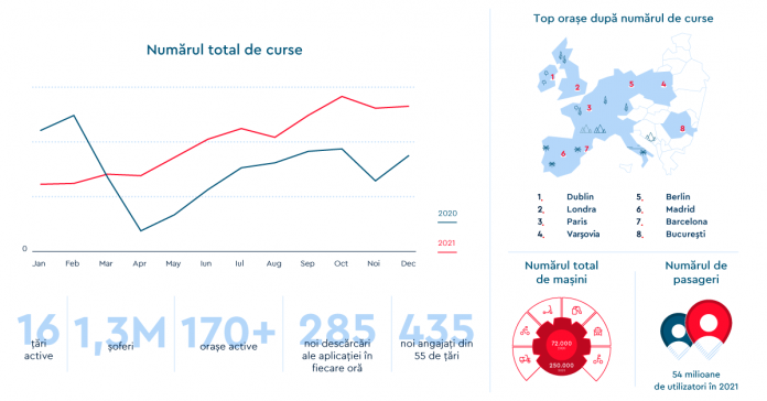 Conform statisticilor de pe platforma FREE NOW, numărul total de utilizatori din toate țările în care operează a ajuns la 54 de milioane. Dintre toate cele 170 de orașe europene în care funcționează aplicația, Bucureștiul s-a clasat pe locul opt în 2021 în ceea ce privește numărul de curse, în timp ce o distanță totală de aproape 24 de milioane de kilometri a fost parcursă în România, echivalentul a 62 de ori distanța dintre Pământ și Lună. Valoarea medie a unei călătorii a fost de aproximativ 17 lei, iar distanța medie a fost de puțin peste 5 km.