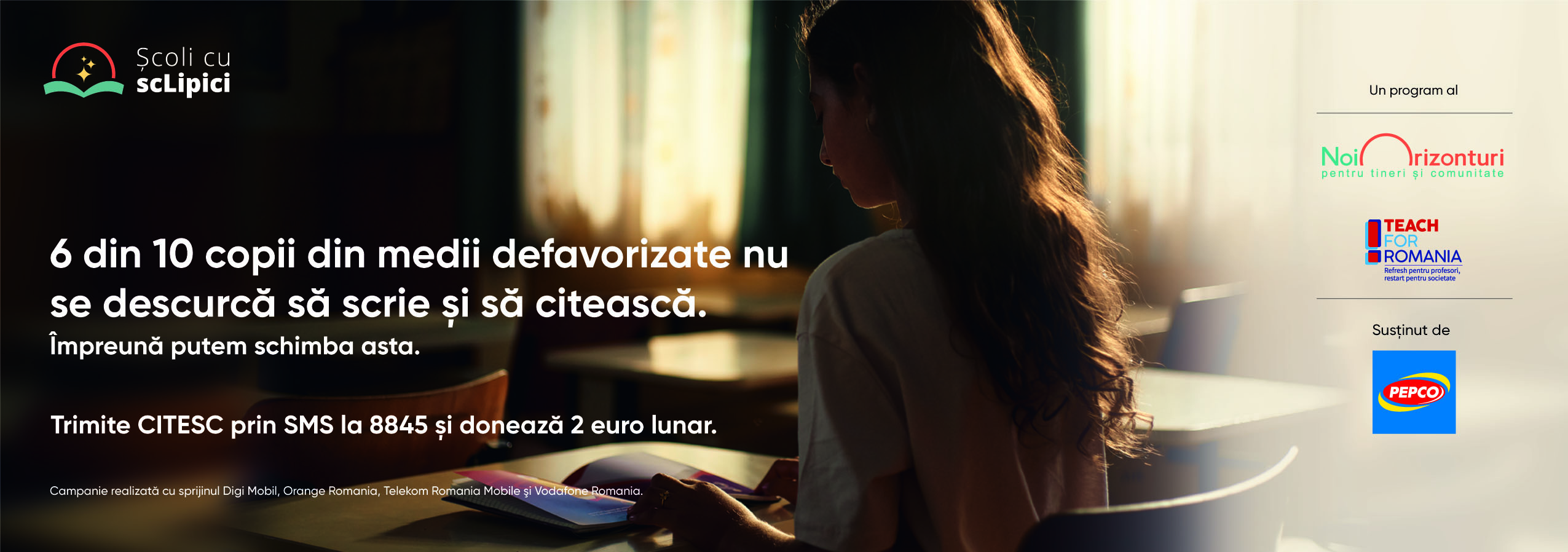 Ajută-ne să oferim fiecărui copil din România șansa de a citi. Fii parte din efortul lor de învățare. Sprijină și tu programul #ȘcolicuscLipici. Trimite CITESC prin SMS la 8845 și donează 2 euro lunar și ajută-ne să ajungem la peste 2000 de copii în acest an școlar cu materiale adaptate vârstei lor. Împreună le putem oferi tuturor copiilor din România șansa să citească și să scrie.