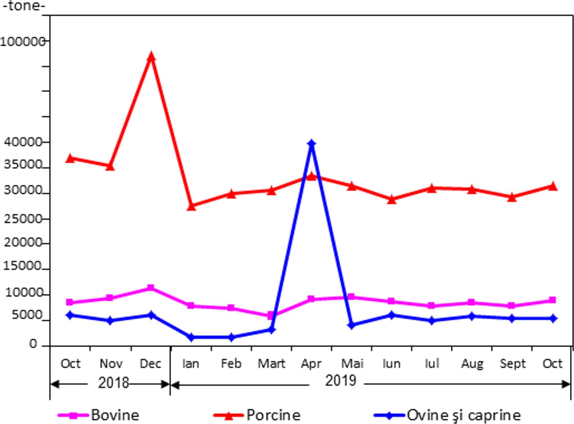 În luna octombrie 2019 faţă de luna septembrie 2019, numărul sacrificărilor şi greutatea în carcasă au crescut la bovine, la porcine şi la păsări şi au scăzut la ovine şi caprine.- În comparaţie cu luna octombrie 2018, numărul sacrificărilor şi greutatea în carcasă au crescut la bovine şi la păsări şi au scăzut la porcine şi la ovine şi caprine.