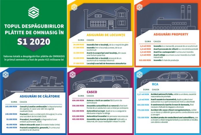 Astfel, pe segmentul PROPERTY, în primul semestru din 2020, cea mai mare despăgubire plătită a fost generată de incendiul la o mansardă, provocat de un scurtcircuit, incident pentru care a fost plătită o despăgubire în valoare de aproape 2,4 milioane lei. Pe locul al doilea, ca urmare a unei avarii provocate de viituri la o microhidrocentrală, se află o despăgubire de aproape 1,8 milioane lei. A treia poziție în topul acestui segment este ocupată de o avarie la o autospecială, în urma unui incendiu, pentru care a fost plătită o despăgubire în valoare de 1,6 milioane lei.