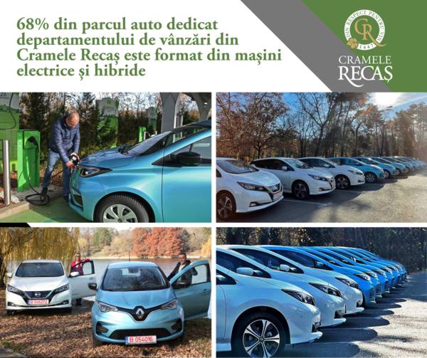 • Flota de mașini electrice și hibride este una dintre cele mai recente investiții de la Cramele Recaș și face parte din planul de sustenabilitate al companiei, ce cuprinde o serie de acțiuni demarate încă din 2019.
