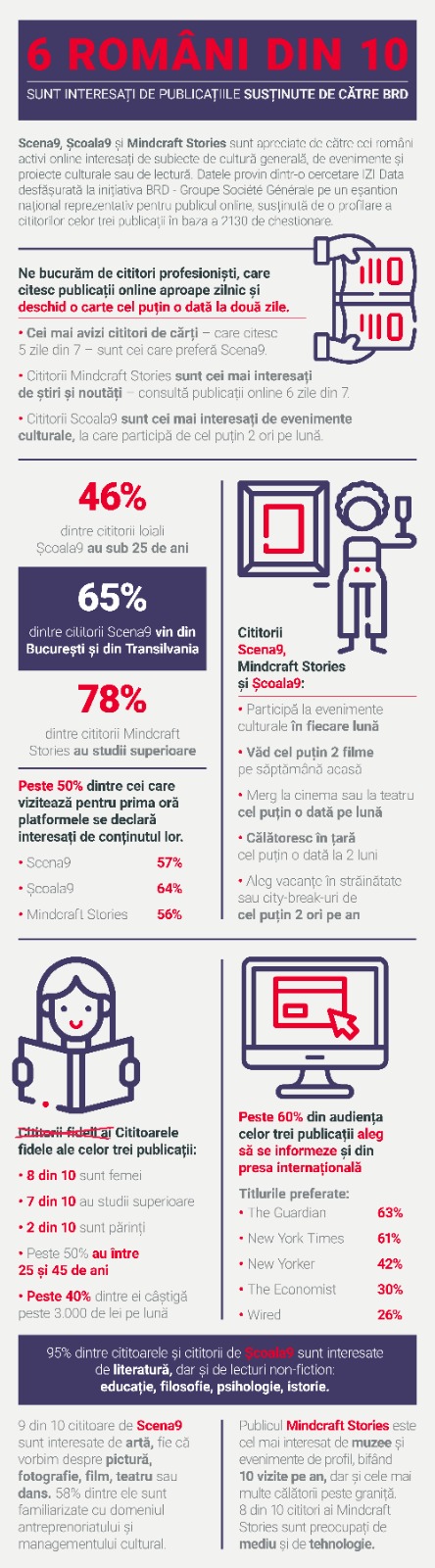 Scena9.ro, Școala9.ro și Mindcraft Stories.ro, publicații inițiate și susținute deja de câțiva ani de BRD, sunt apreciate de către românii cei mai activi în spațiul digital, interesați de cultură, evenimente artistice, educație și știință. 74% dintre cititorii Scena9 au studii superioare, cifrele fiind apropiate pentru Mindcraft Stories (78%) și Școala9 (68%). Datele provin dintr-o cercetare IZI Data desfășurată în ultima parte a anului trecut, la inițiativa BRD Groupe Société Générale pe un eșantion național reprezentativ pentru publicul online, susținută de o profilare a cititorilor celor trei publicații în baza a 2130 de chestionare.