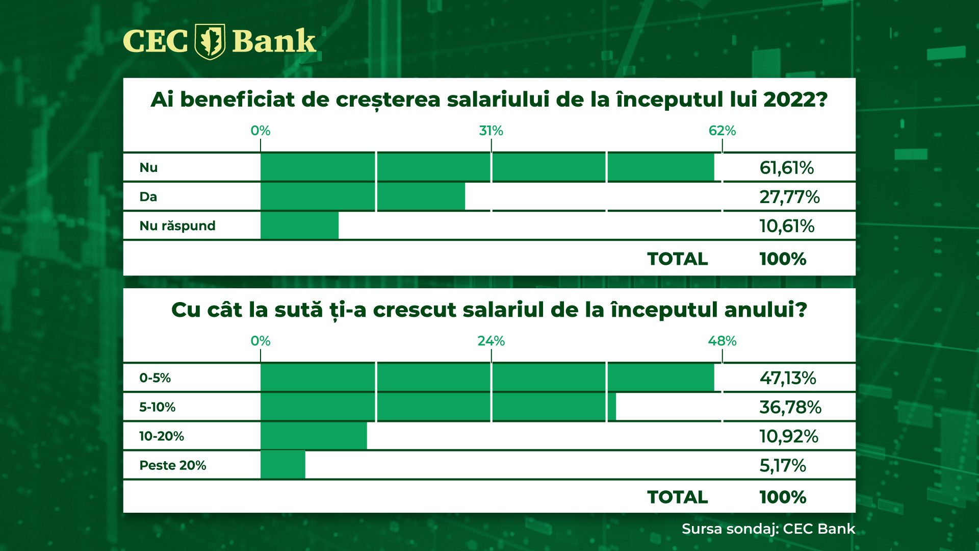 La întrebarea dacă au beneficiat de creșterea salariului de la începutul anului, 61,6% dintre respondenți au precizat că nu au beneficiat de majorări salariale, 27,7% au spus că salariile le-au crescut, în timp ce 10,6% au ales să nu răspundă la întrebare. Sondajul a fost realizat în luna octombrie.