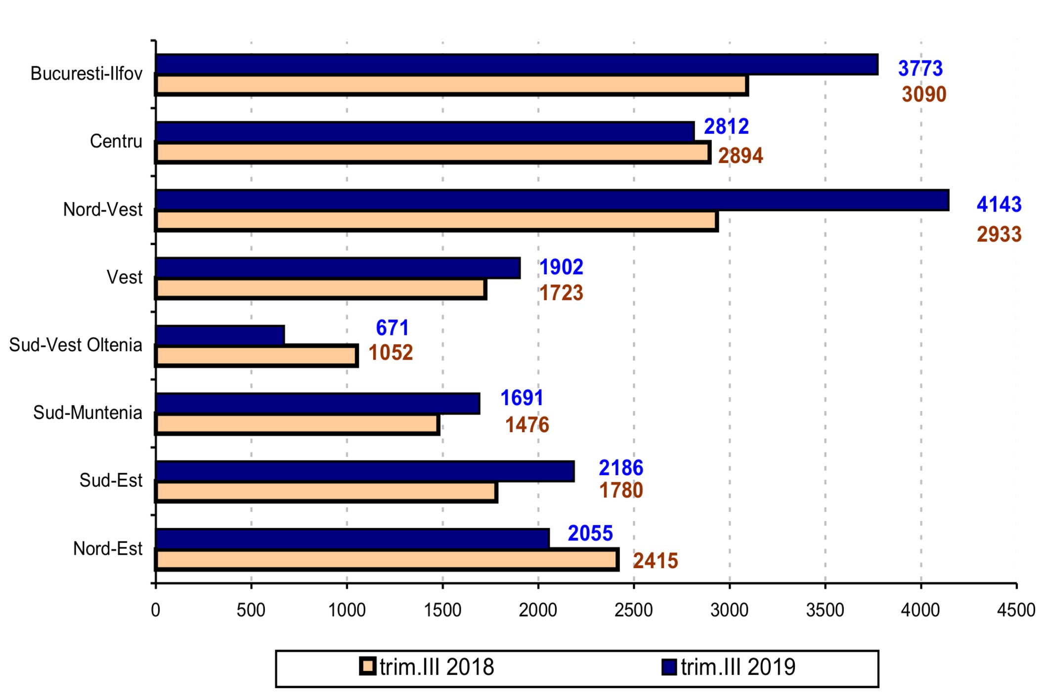 Distribuţia în profil regional în trimestrul III 2019 comparativ cu trimestrul III 2018, evidenţiază o creştere a numărului locuinţelor terminate în următoarele regiuni de dezvoltare: Nord–Vest (+1210 locuinţe), Bucureşti–Ilfov (+683), Sud-Est (+406), Sud–Muntenia (+215) şi Vest (+179).