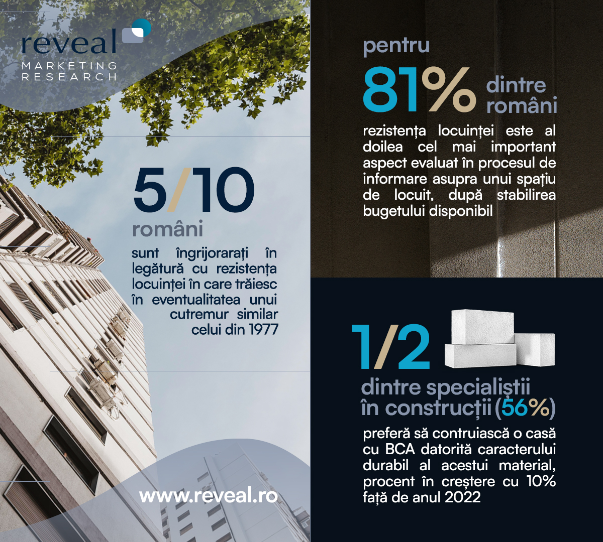 Reveal Marketing Research a derulat un studiu la nivel național privind percepțiile și comportamentele românilor și ale specialiștilor în construcții referitor la caracterul durabil și rezistent în timp al spațiilor de locuit și despre cât de importantă este nevoia locatarilor de a se simți protejați și în siguranță pe termen lung în fața seismelor sau intemperiilor.
