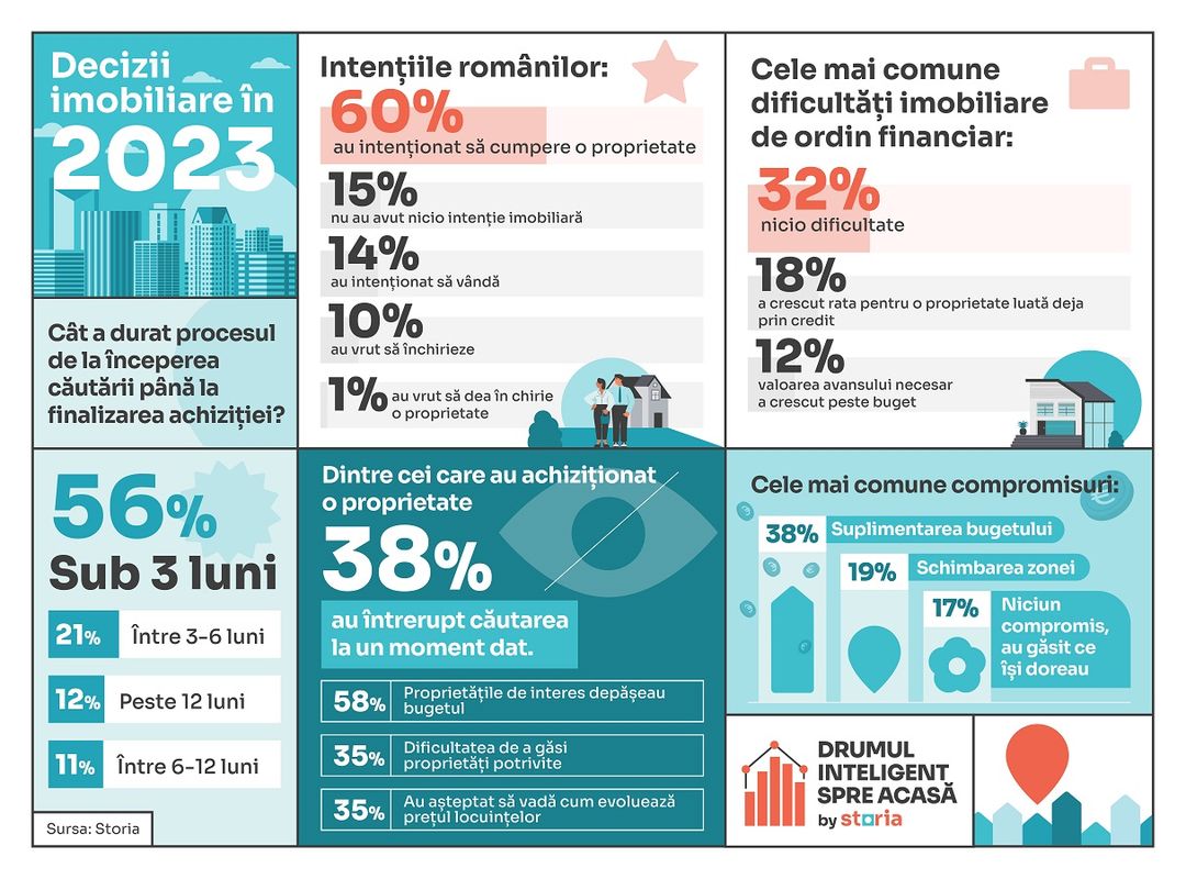 Datele arată că, în 2024, utilizatorii de pe platforma Storia își propun să vizualizeze anunțuri imobiliare (62% din totalul respondenților), iar 53% au declarat că vor să și vizioneze proprietățile de interes. În plus, o mare parte și-a propus să consulte un broker sau banca pentru opțiunile de creditare (35%). De asemenea, utilizatorii își propun să urmărească știrile relevante pentru domeniul imobiliar (24%), în timp ce 22% și-au propus să lucreze cu un agent imobiliar.