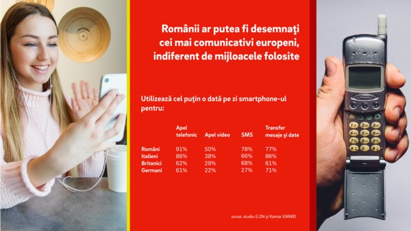Complet atipici, românii îmbrăţişează noua tehnică de comunicare fără să renunţe la „vechile obiceiuri“. Pur şi simplu, comunică mai mult, având lejer posibilitatea să-şi revendice locul întâi la nivel european, în acest domeniu. Potrivit unui studiu realizat de E.ON şi Kantar EMNID, 91% dintre români utilizează măcar o dată pe zi telefonul mobil pentru a iniţia o convorbire, în timp ce 1 din 2 utilizează zilnic apelurile video prin intermediul aplicaţiilor care au această opţiune.