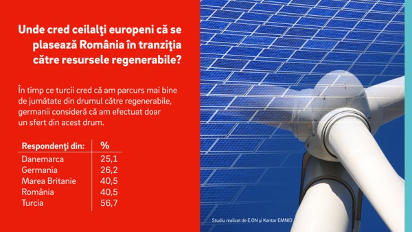 Ţările europene şi-au fixat obiective ambiţioase privind trecerea de la producţia de energie bazată pe surse convenţionale (cărbune, gaz etc) la cea din surse regenerabile (fotovoltaice, eoliene sau hidro), dar una din întrebările momentului este cât de mari sunt progresele bifate în această direcţie. Un sondaj realizat de E.ON şi Kantar EMNID în 10 ţări încearcă să vină cu un răspuns, reliefând percepţia europenilor chestionaţi în ceea ce priveşte nivelul de reuşită atins până acum în tranziţia către sursele de energie prietenoase cu mediul.
