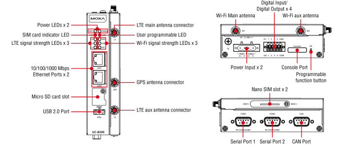 Sistemele UC-8200 sunt echipate cu conectivitate LTE Cat. 4 încorporată și oferă suport dual-SIM pentru redundanță, în timp ce funcția GPS integrată permite localizarea rapidă. Suplimentar, poate fi adăugată conectivitate Wi-Fi prin intermediul unor module de extensie. Pentru o integrare mai ușoară în sistemele existente, Moxa oferă un utilitar de administrare, cu ajutorul căruia programatorii pot configura rapid funcțiile celulare ale computerelor. Compatibilitatea wireless cu furnizorii regionali este asigurată prin aprobări RF, precum FCC, IC, PTCRB, RED, RCM și NCC*.