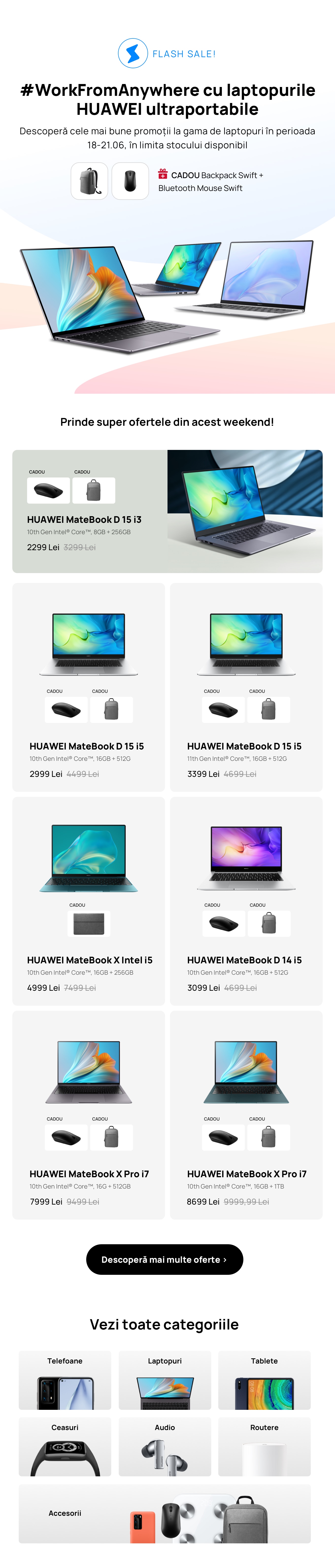 Huawei Online Store continuă seria de oferte speciale dedicate fiecărui weekend, de data aceasta cu reduceri și mai atractive de tip Flash Sales pentru categoria de laptopuri. Oferta de weekend, #WorkFromAywhere, vine în întâmpinarea consumatorilor care își doresc laptopuri performante, ultraportabile și cu un design atrăgător, pentru a putea lucra de oriunde și oricând, având parte de un randament ridicat.