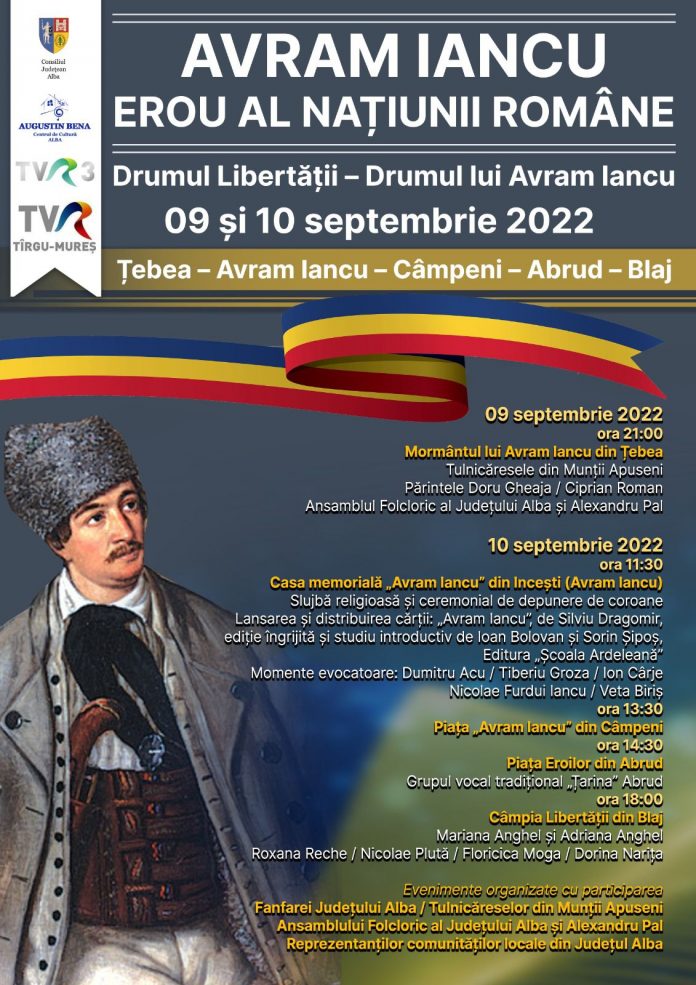 Proiectul cultural „Drumul Libertății – drumul lui Avram Iancu” începe vineri, 9 septembrie, la ora 21:00 la Țebea, locul unde este înmormântat eroul național. Programul va fi deschis de tulnicăreselor din Munții Apuseni, urmând apoi un program cu muzică patriotică susținut de părintele Doru Gheaja, Ciprian Roman, Ansamblul Folcloric al Județului Alba și Alexandru Pal.