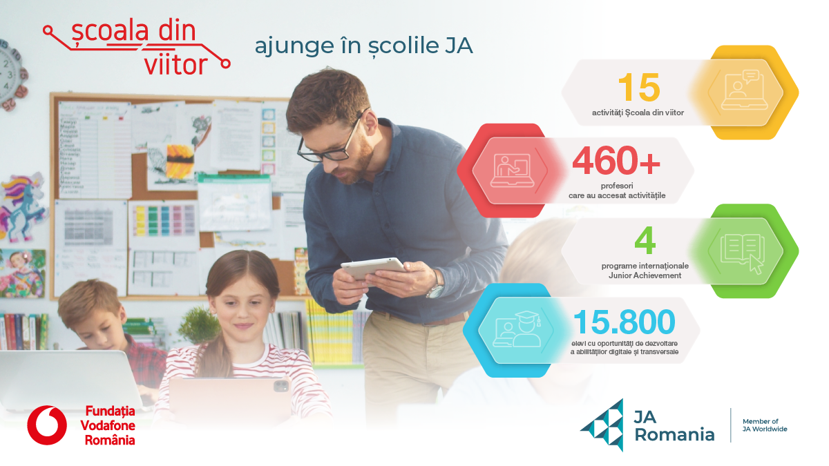 Proiectul Școala din viitor ajunge în școlile JA are ca obiectiv extinderea oportunităților de învățare learning by doing și a promovării unui model educațional transdisciplinar rezultat prin alăturarea experiențelor internaționale promovate de Junior Achievement și Fundația Vodafone România.