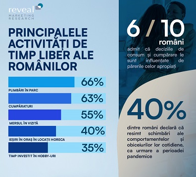 - Principalele activități de timp liber ale românilor sunt plimbările în parc (66%), cumpărăturile (63%), mersul în vizită (55%) și ieșirile în oraș în locații Horeca (40%)