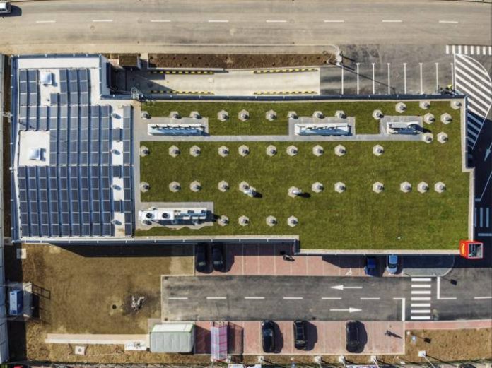 - Pe acoperișul magazinului sunt 120 de panouri fotovoltaice, 55 de tuburi solare care aduc lumină naturală și difuză în magazin, precum și aproximativ 1.000 de mp de acoperiș înierbat.