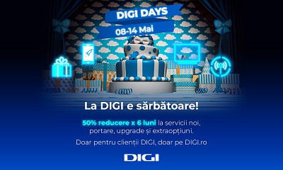 - În perioada 08 – 14 mai, DIGI răsplătește fidelitatea clienților săi prin intermediul campaniei „DIGI Days” și oferă 50% reducere din valoarea abonamentului lunar, pentru primele 6 luni consecutive, indiferent de serviciul contractat;
